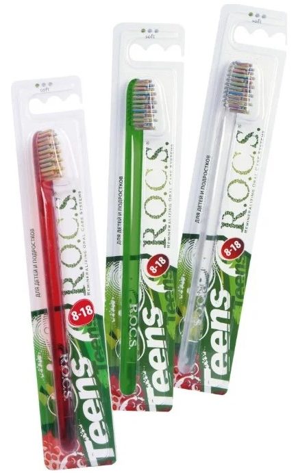 Brush of the Teens series from the Russian company R.O.C.S. designed for children and adolescents from 8 to 18 years old. It is available in 3 colors: transparent, green and red. But most of all, this tool is distinguished from other similar products by a special trimming of the bristles: shortened towards the end, they allow you to reach far-away teeth and effectively clean them of plaque. The hairs of the bristles also differ. They have polished, rounded tips that do not injure delicate gums and sensitive enamel.
