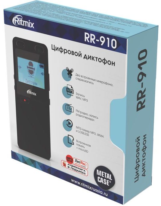 Compact voice recorder with dimensions 104x41x11 mm and reproducing stereo sound is equipped with two built-in microphones of excellent quality. The device operates in two sound recording modes MP3 and PCM (WAV) and is capable of playing several audio formats: MP3, WMA, DRM WMA, OGG, APE, FLAC, WAV, AAC-LC, ACELP, Audible. Depending on the version, the Ritmix RR-910 has built-in memory of 4GB and 8GB, and also provides the ability to connect MicroSD (up to 32GB). The presented model is equipped with an FM tuner, two 3.5 mm jacks and one Micro-USB input.