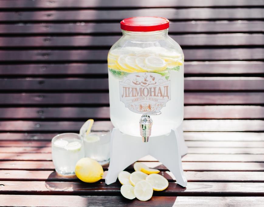 Lemonade of this type is suitable for a large company at a country picnic, and will also become an indispensable item in the office. The volume is impressive: the dispenser can hold up to 8 liters of liquid. The material from which the container is made is glass.