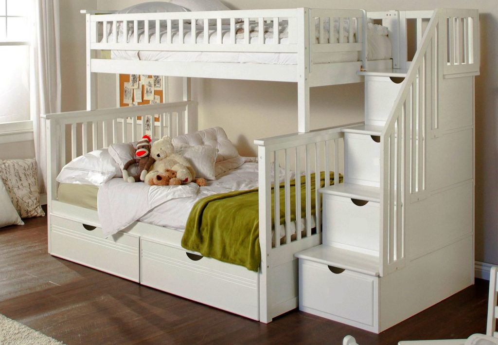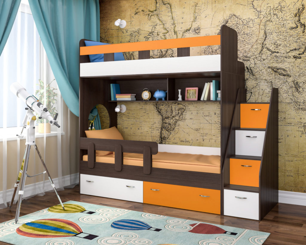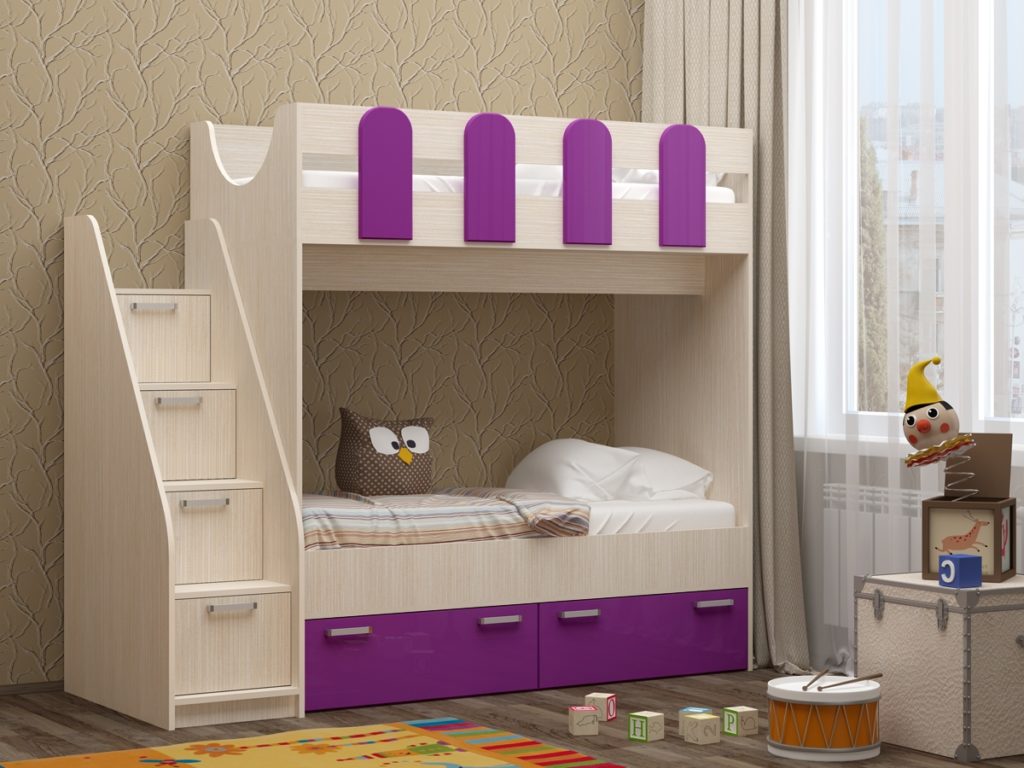 For a family with two children, the model will be the best solution. The furniture is equipped with two tiers, between which there is a convenient shelf with two sections. The shelf is suitable for placing books, a glass of water, necessary things and objects, toys. The space under the lower tier is equipped with drawers with convenient wheels. A huge plus is the presence of a staircase, which resembles a 4-step rack. The interior is equipped with shelves with doors. Furniture is assembled to the left or to the right, depending on the corner in which it needs to be placed. It is also possible to place the stairs from different sides.