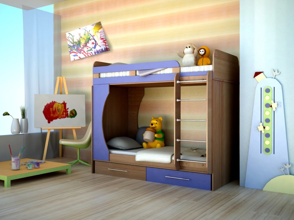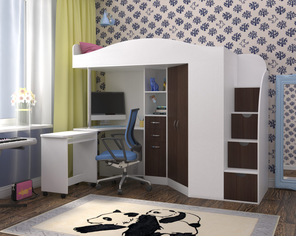Modular structures equipped with two berths are compact in size and allow efficient use of the available space. The lower bed is usually occupied by a younger child. The top seat goes to the older family member. Children of school age have a better developed consciousness, they control themselves well during sleep. Babies, when they sleep, very often turn around, so there is a high probability of the child falling out of bed. These beds are usually made with high sides.