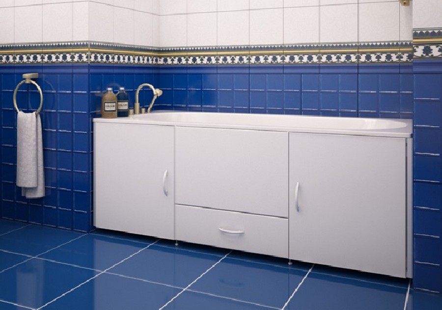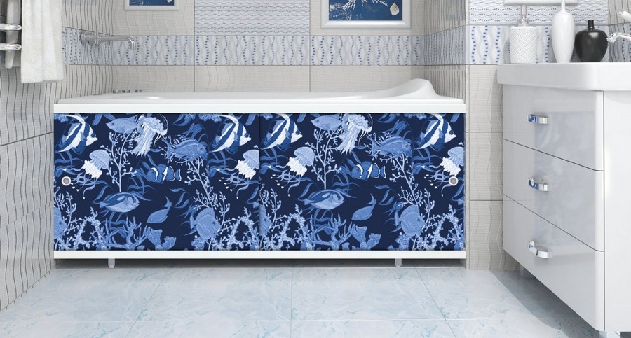 The screen itself is a decorative element that is designed to be installed under the bath bowl, and it usually consists of a frame (made in the form of a frame or two guides) and a front panel. This element can be made in the form of sliding / hinged doors, can be angular, solid or straight, or even consist of several elements.