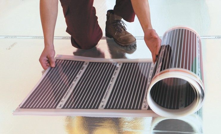 This floor can be installed under any final floor covering. It is worth remembering that the film does not like deformations, and it must be laid on a flat, dense surface (for example, plywood sheets with a thickness of at least 1 cm). It is also not advisable to put furniture on it. To increase heat transfer, it is advisable to put thermal insulation under the infrared film. Power ranges from 100 to 200 W / m2... Most often this floor is used for additional heating. Despite all the innovation, the term of use is shorter than that of other species - within 15 years.