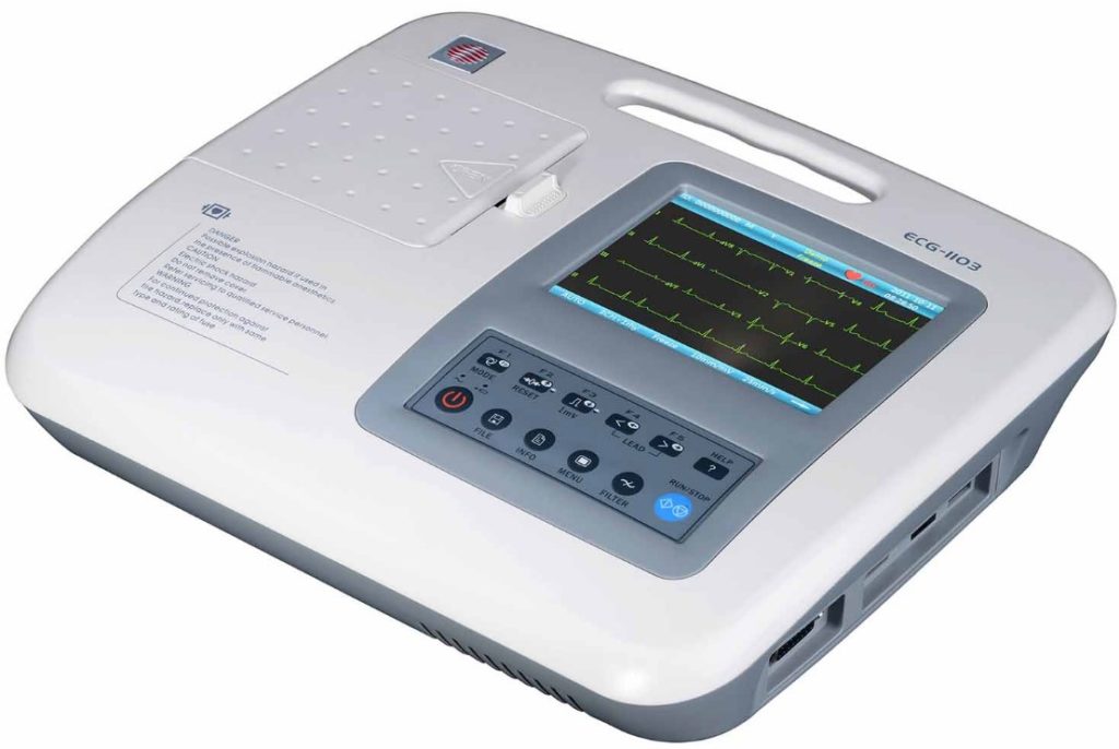 This cardiograph is produced by the Chinese company Shenzhen Carewell Electronics Co. The device is Russified. Equipped with a 3.8 "backlit monochrome LCD screen, which during operation displays the current lead, patient's heart rate, operating characteristics (mode, sensitivity, filters, paper feed speed, battery level, etc.). The device automatically measures and interprets the ECG based on the CSE and AHA databases. The heart rate measurement range is from 30 to 215 beats per minute with an accuracy of 1 beat. The ECG results are displayed using a built-in thermal printer on thermal paper 50 mm wide, the recording width is 48 mm. The paper feed speed can be adjusted from 5 to 50 mm / s. The cardiograph operates both from a 220-240 V household network and from a built-in battery that can withstand up to 500 charging cycles. It takes 8 hours to fully charge the battery.