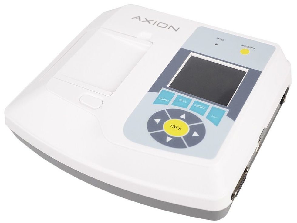 Electrocardiograph from the Russian manufacturer "Axion" with the ability to register simultaneously from 1 to 3 leads. The device is equipped with a color LCD display measuring 58 x 43 mm (diagonal 2.8 ''), in which you can change the brightness of the backlight. To obtain the most accurate measurements, the device has anti-tremor, anti-drift and notch filters. There are 2 operating modes: auto and manual. The cardiograph records the heart rate in the range of 30-300 beats / min. In addition to constructing typical cardiocycles, it is possible to construct a rhythmogram, a histogram and a scattergram. The device automatically registers arrhythmias and also detects the presence of a pacemaker. The cardiogram is displayed using the built-in thermal printer at a speed of 25, 50, 5, 12.5 mm / s. The internal memory is sufficient for recording 500 ECGs. Connection of external media is possible. The device operates both from the mains and from the built-in battery.