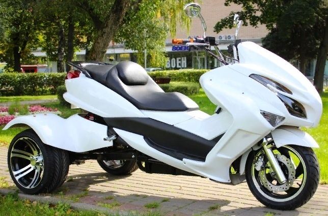 A technique with double shock absorbers, rear-wheel drive and disc braking system is suitable for any man. The body of the model is made in the style of a sports bike. Seat material - artificial leather. The tires are vacuum. There is a footrest for additional balance when stopping or parking. Suitable for quiet city driving and high-speed highway driving.