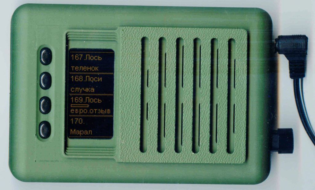 The device of this brand is intended for hunting and can reproduce 90 sounds of birds and fur game. If the sound was played more than four times, then the device automatically sends it to the favorite group. The device weighs only 160 grams. The device is powered by a permanent Alkaline battery. She looks like "Kron". In addition, you can additionally connect a power supply. The decoy can operate at temperatures from -20 to +40 degrees.