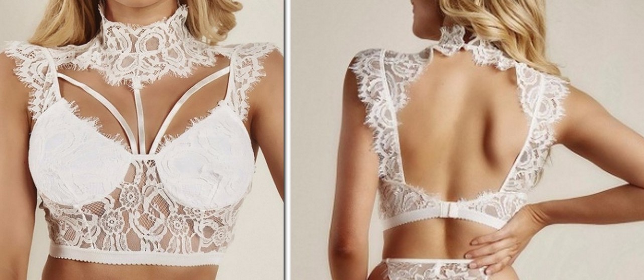 The lace product in white with a 3/4 cup has an incredibly beautiful design.In the front there are lace straps from the top of the cups, and in their lower part there is a wide transparent patterned strip with an elastic band, which fastens at the back. The throat is decorated with an ergonomic collar, the neckline in the chest area forms a heart shape, which is equipped with three dense decorative stripes. Thanks to the fastening on the neck (button) and a hook in the lower area of the product, a circle is formed on the back.