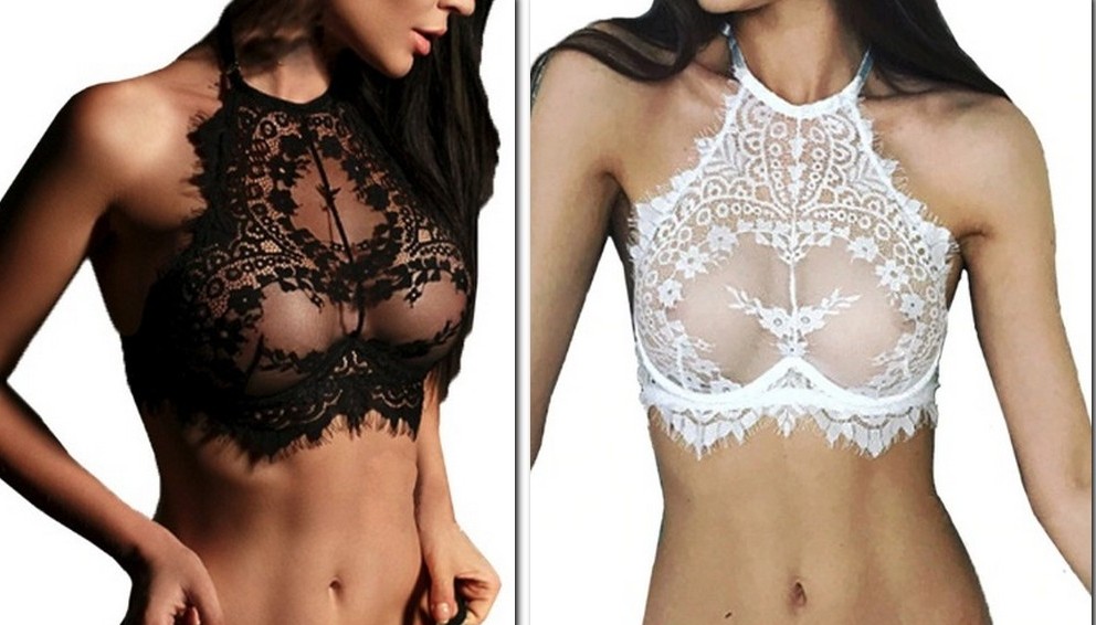 Erotic lingerie in the form of a top. The chest is supported only at the bottom. The bra is fastened in two places: on the neck and on the back. See-through material with lace patterns. In the summer, you can wear the product under a jacket.