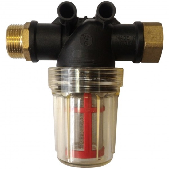 Water supply filter for use in professional pressure washers. Good cleaning ability of 100 microns with a capacity of 55 liters per minute. Robust housing with transparent bulb for visual inspection of the degree of contamination. Detachable design provides easy flushing from dirt.