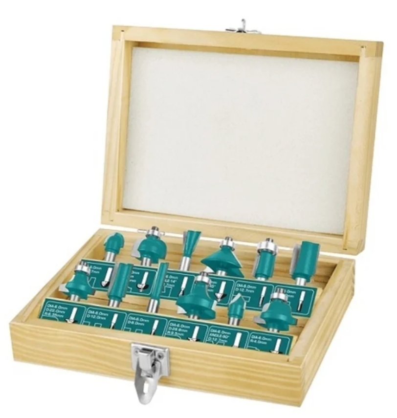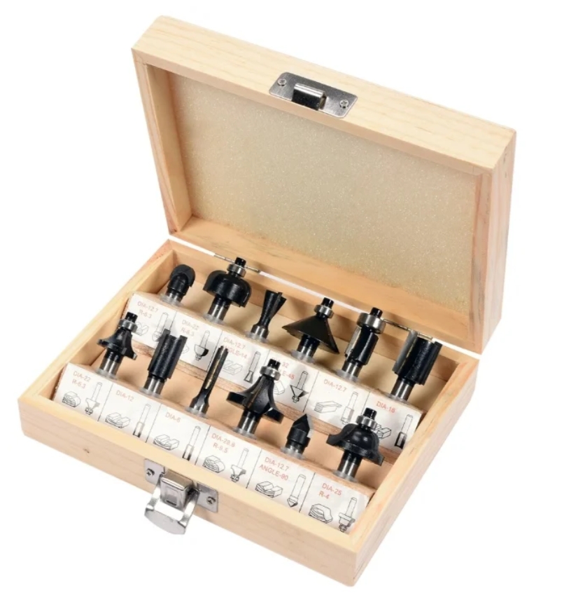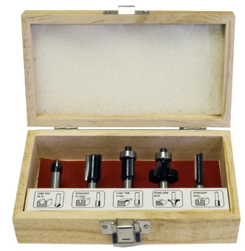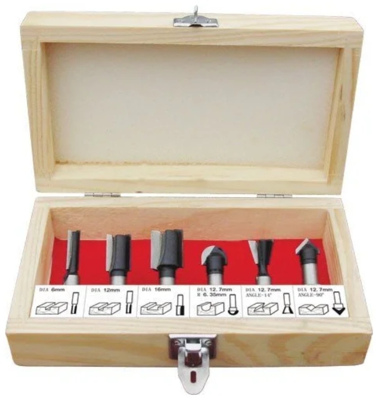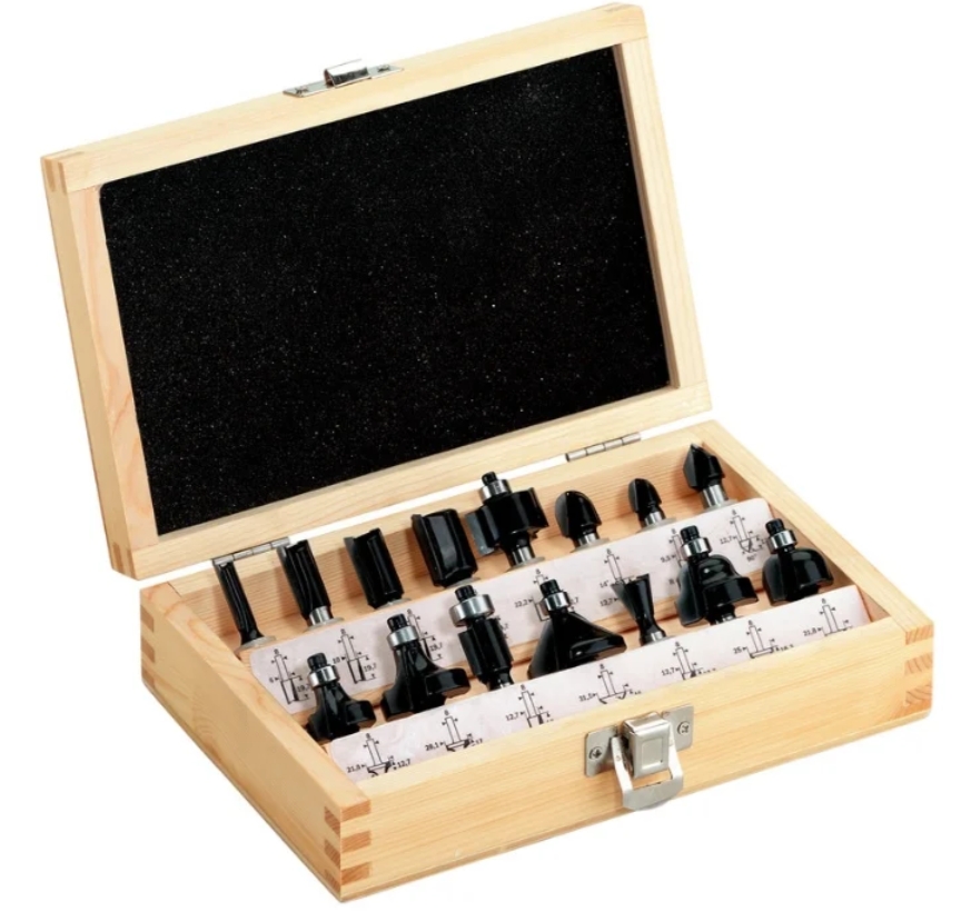 FIT IT 36566 attachments handle wood blanks, various grooves. The set includes a plywood case for storage and transportation. Good as a first set for beginners. Tungsten carbide cutters.