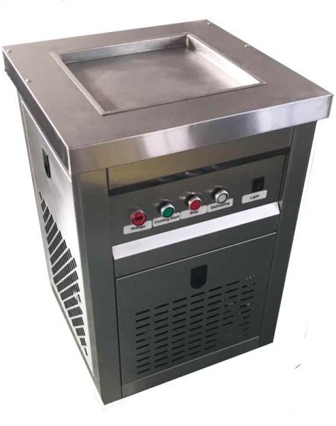 The device is used in catering establishments for preparing roll ice cream. This product means fried ice cream in rolls. The model has mechanical control. The user independently sets the appropriate temperature regime. 3 cylindrical containers are used for mixing the mixture, the frying pan is made of stainless steel and will last for a long period. The device weighs only 37 kg.