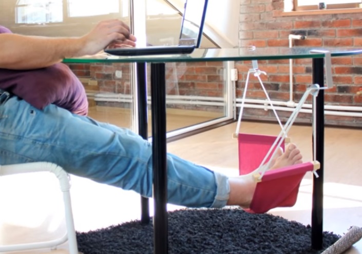 During prolonged sitting at a table on a chair or armchair, there is discomfort in the legs, and a desire to give the legs and back a rest. It is easier to do this at home, you can get distracted from work and go to rest or switch to another activity. But in the office you can't afford that. Therefore, they came up with a device that attaches under any kind of table and makes it possible to relax. The height of the hammock can be adjusted at will, a lower position is recommended for work, and for relaxation it is recommended to raise the hammock higher to the table top.