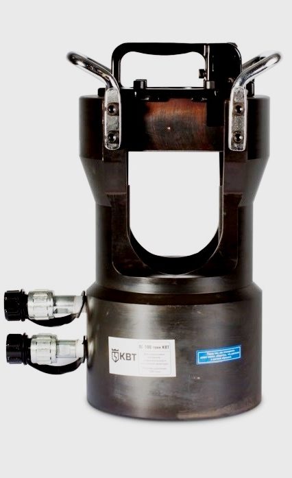 Two-valve design. Belongs to the category of professional tools. With its help, connecting, tension and contact fittings are pressed. The maximum effort is 100 tons. The head is conveniently opened by turning the top cover. The manufacturer, for ease of movement, provides steel handles. If there is a need for hexagonal or round dies, they are made to order and purchased separately from the main equipment for an additional fee.