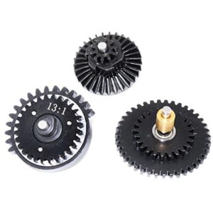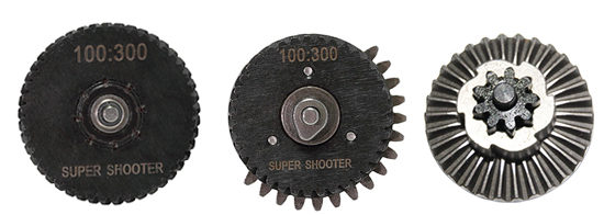 Made of steel, the reduced gear ratio allows for larger springs up to and including SP150 Guarder. Use with bearings can lead to their destruction, the use of bushings is recommended. A bearing is integrated in the middle and sector gears.