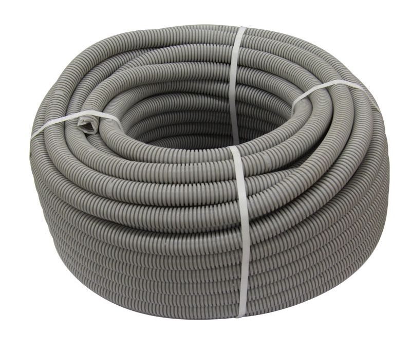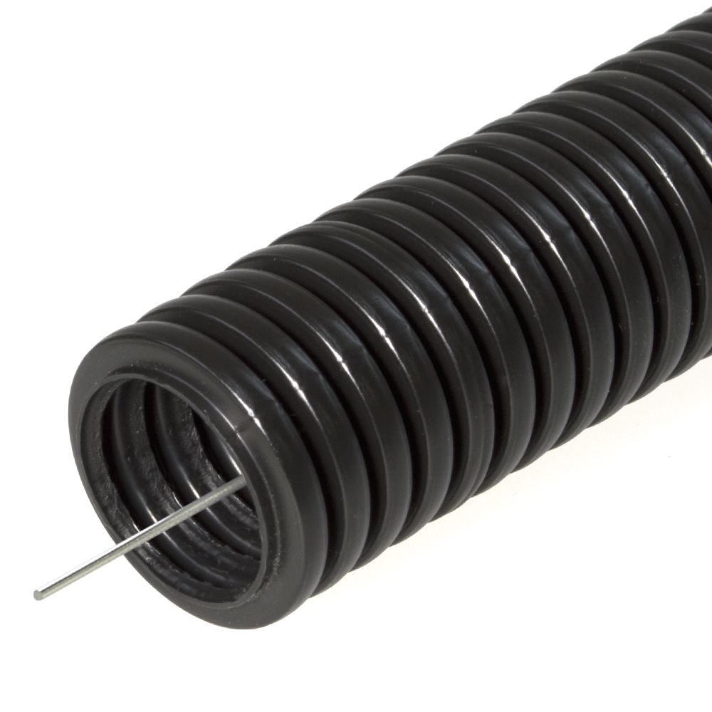 The corrugated pipe is designed for electrical wiring. The product is equipped with a broach and is intended for use both indoors and outdoors. Made of PVC, can withstand high temperatures.