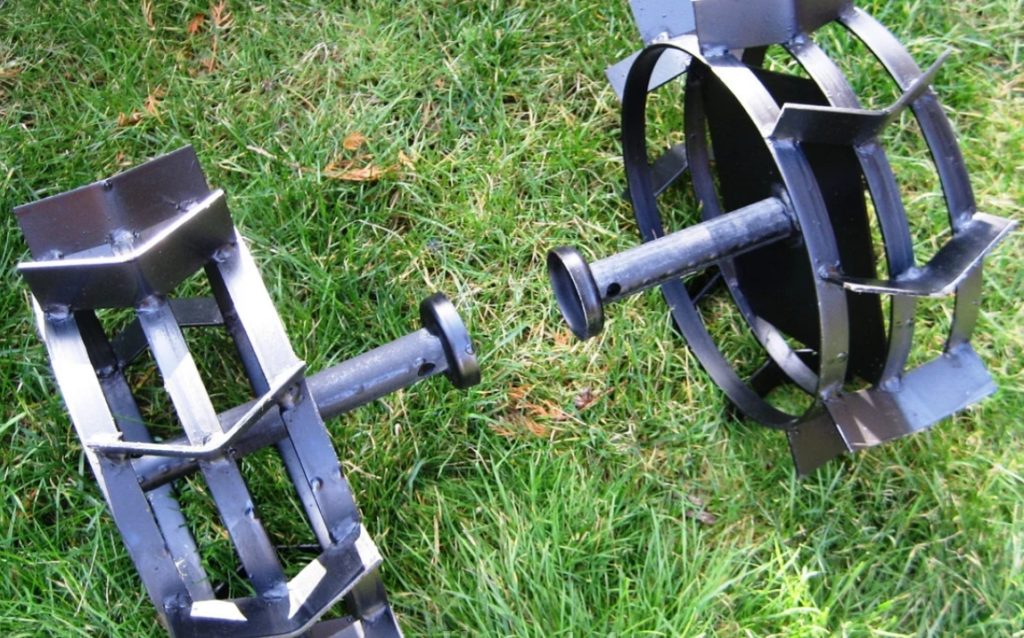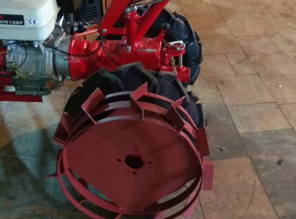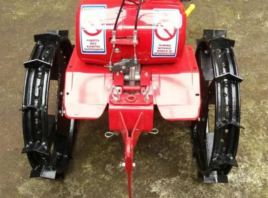 Additional equipment, which are iron wheels attached to the walk-behind tractor in place of relatives, rubber wheels, are made according to the same principle, but differ slightly in appearance.