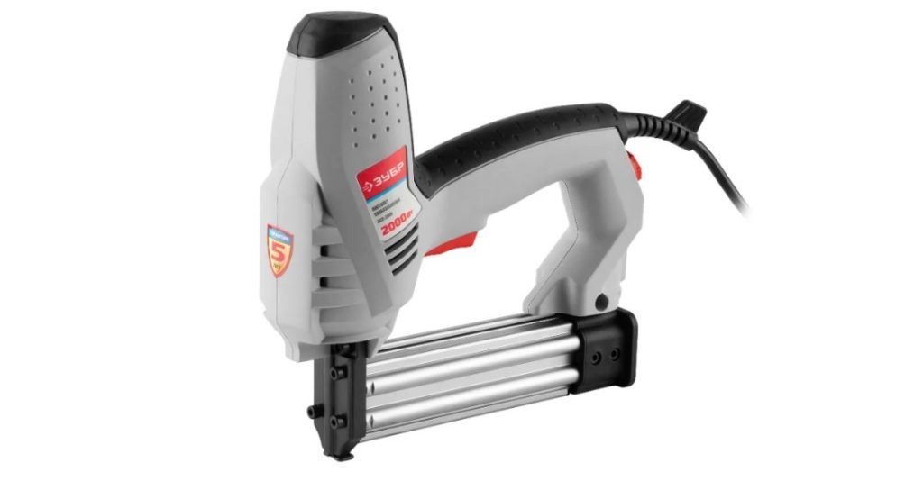 A mains stapler is used to attach cardboard, fabric, paper and various other materials to a wood base. Under external influence, the fasteners easily enter the surface. The productivity is 30 beats per minute. The device has an indicator of the number of staples and nails for the rational use of consumables.