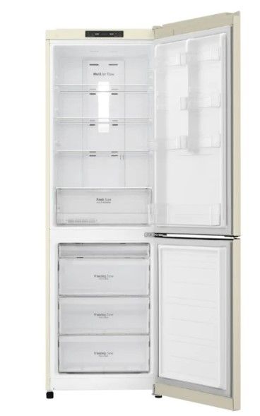 The two-compartment model with a classic bottom freezer arrangement with a durable plastic body with a metal finish is made in a cozy beige color. The refrigerator is equipped with an inverter compressor and an external electronic control display. Thanks to a special cooling system, it maintains a uniform temperature in all compartments of the refrigerating chamber.