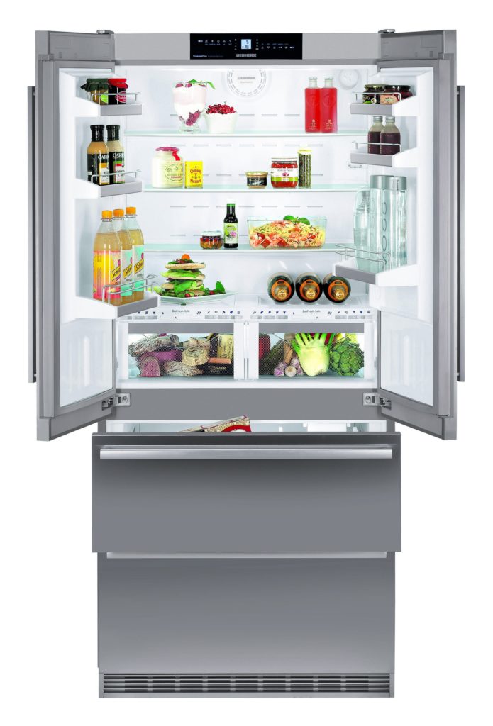 The only Liebherr French Door refrigerator currently on sale. Perhaps this is due to low demand, the reason for which is the high cost of the model (it is comparable to the price of a budget car) - 285,000 rubles.This price is due not only to the impressive dimensions of the product, but also to wide functionality, which includes lighting of the freezer, child lock, various types of indication of breakdowns, an ice generator, a wine shelf, inverter technology, a customizable freshness zone and many other convenient functions. ... The refrigerator has electronic controls and an internal display.