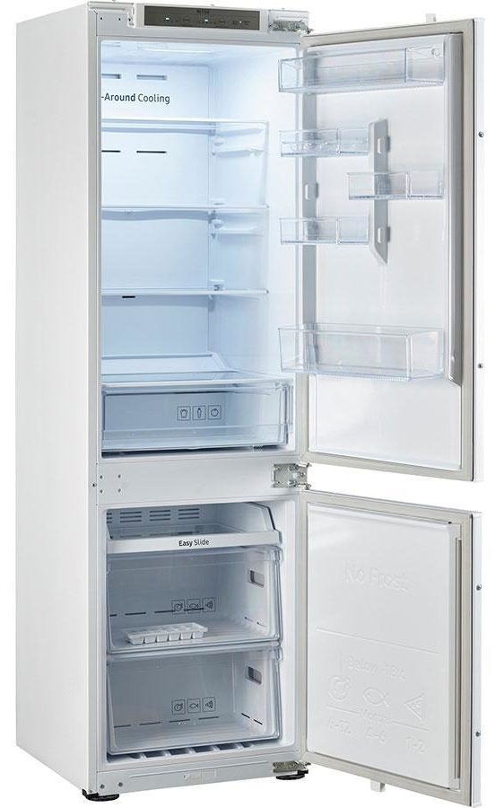 A built-in model of a two-compartment refrigerator weighing 57 kg and measuring 54x55x177.5 cm. Its useful volume has been increased to 286 liters. The cooling compartment has a capacity of 196 liters, the freezer - 72 liters. Isobutane (R600a) acts as a refrigerant. An inverter compressor is used for its circulation. The noise level is 37 dB, energy class A +, which is 291 kWh / year.