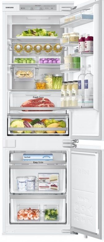 Built-in double-leaf refrigerator with Twin Cooling Plus electronic temperature control and a total volume of 263 liters. Of these, 191 liters are used for the cooling chamber and 72 liters for the freezer. The system provides stable humidification or drying of air inside the compartments. Maintaining the cold and chamber ventilation are separate from each other by separating the circuits.