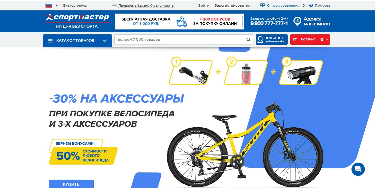 Leading platform representing a large retail chain. There is a huge (about 40 thousand) selection of not only bicycles, but also spare parts and accessories. The online store is known among athletes and those people who prefer an active lifestyle. In the company's catalog you can see all the popular brands: Format, Giant, Smart, Stels, Merida, Electra, Trek, Cube, Bulls and many others, and the model range includes more than 10,000 items - urban, road, extreme, mountain, etc. .d.