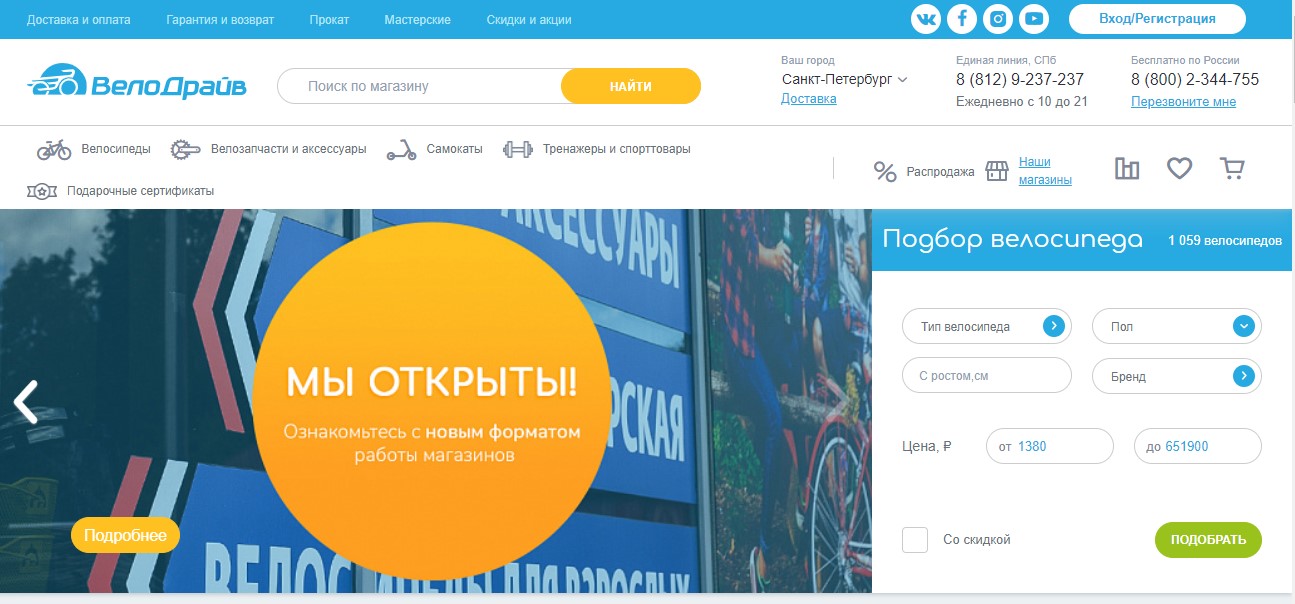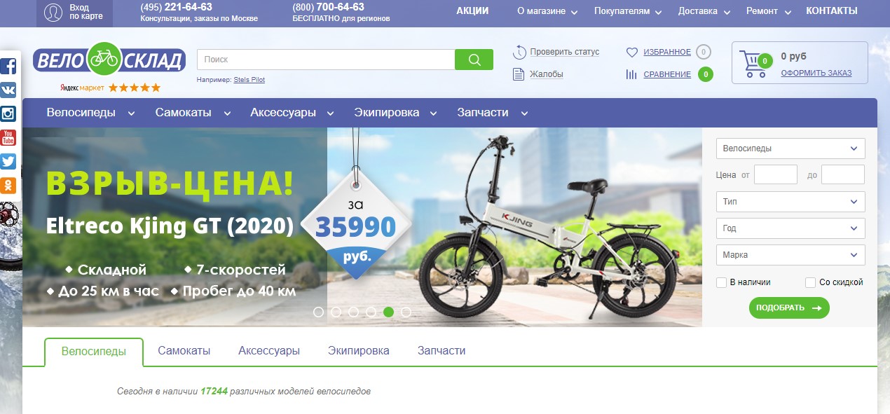 On the main page of the site, you can read information that more than 1,200,000 consumers have already made purchases here, which indicates the reliability of the company and the high quality of the goods. The low cost is due to the fact that the products are purchased from manufacturers and official dealers. There are 15,000 bicycles in stock such brands as: Aspect, Cube, Format, Scott, Merida, Trek, Stinger. Here you can buy the following categories of bicycles on favorable terms: for men, for women, for children, mountain, city, road, folding, stunt, fat bikes, electric bicycles, etc.