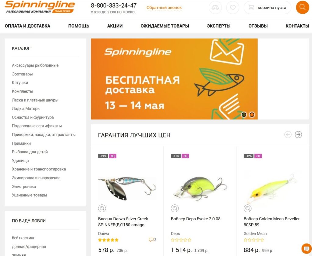 The catalogs contain products from more than 100 Russian and foreign companies. Each position on the site is supplemented with a detailed description, and in case of difficulties or questions, an online expert will come to help the buyer. Detailed answers to frequently asked questions are located in the "Help" section, where you can also learn more about current discounts, bonuses, and ongoing promotions. In addition, in the "Experts" section there is a "Users" tab where you can consult or chat with professional anglers. New deliveries can be found in the "Expected Items" section, where Spinningline provides customers with a receipt schedule with the manufacturer's name.