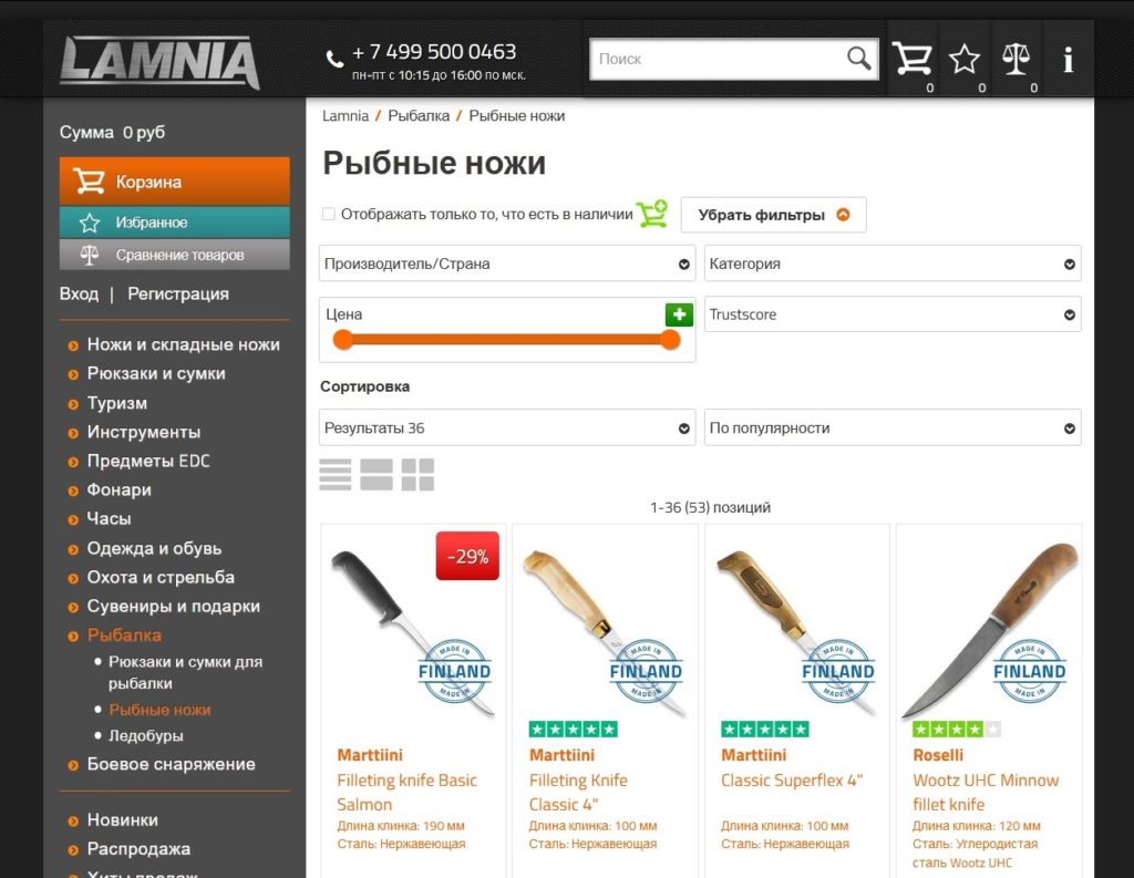 Lamnia is a Finnish online store dedicated to fishing accessories, as well as accessories for hunting, shooting, outdoor activities and tourism. The site interface supports several languages - Russian, English, German, French, Spanish, Norwegian, Swedish and others. Customers are offered a wide range of various accessories that allow them to spend their holidays in nature safely and comfortably: