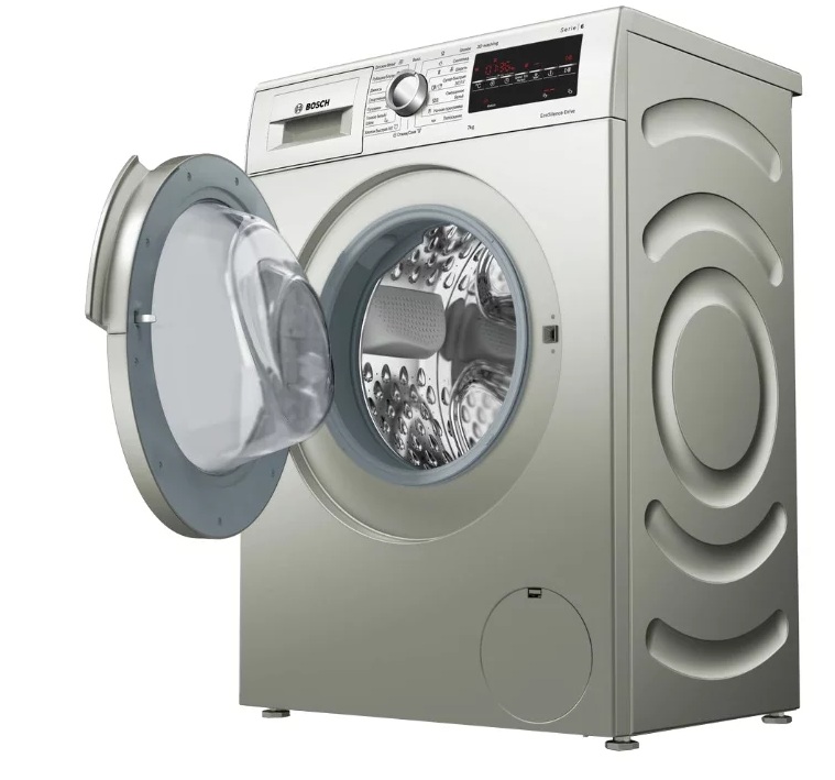 Product description: freestanding appliances (brand "Bosch") with front loading of laundry are equipped with sturdy legs that give it stability, a large display and a touch control panel. The choice of the washing mode is set using the rotary switch. On the sides there is an embossing in the form of a circle and waves emanating from it. The drum is bubbly, in large drop-like patterns.