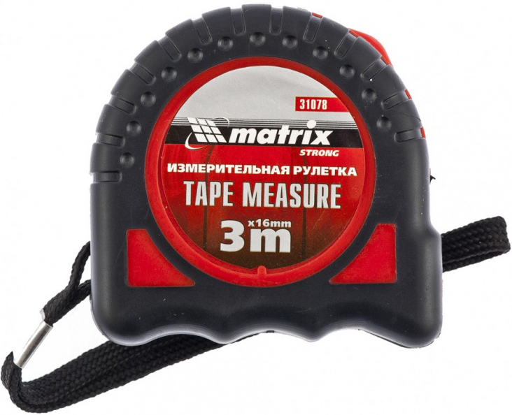Steel 3-meter tape, 16 mm wide, coated with a polymer layer to protect against abrasion. The body material is shock-resistant plastic, which is partially covered with a rubber layer. The hook is made of metal. Two mechanisms for fixing the canvas. The tool is equipped with a convenient strap and a steel clip for attaching to a belt.