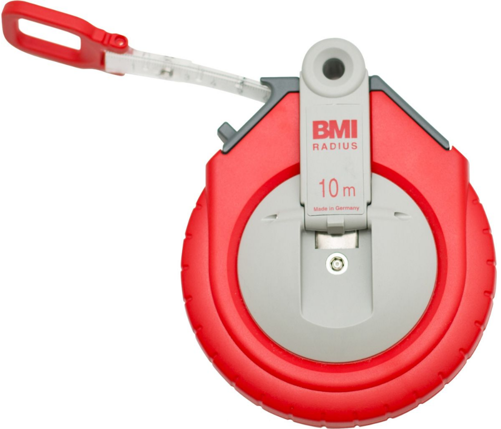 10m fiberglass tape. Closed plastic case. Small plastic handle for mechanical winding, folds into the body. The hook is a plastic ring.