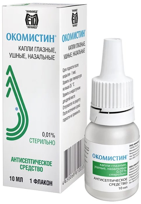 The main component of Okomistin is Miramistin, an antiseptic with a bright antimicrobial effect. It is effective against gram-positive, gram-negative, aerobic and anaerobic bacteria.Also, in combination with antibiotics, it helps to fight chlamydia, pathogenic fungi, adenovirus, herpes virus. The dosage is 1-2 drops up to 6 times a day. It is used to treat children from 3 years old.