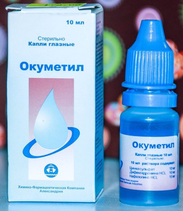 Okumetil contains 3 active ingredients: zinc sulfate, naphazoline hydrochloride and diphenhydramine hydrochloride. This combination of active substances provides simultaneously astringent, anti-inflammatory, antiseptic, vasoconstrictor and anti-allergic action. To obtain a positive result, it is enough to bury the eyes for 3 days, 1 drop 3 times a day. Sold without a prescription.