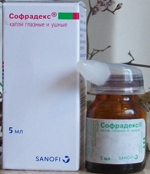 These Sofradex contain antibiotics framycetin sulfate and gramicidin in combination with the glucocorticosteroid dexamethasone (a hormone), which are responsible for the antibacterial properties of the drug. It has been proven effective against gram-positive and gram-negative microorganisms, streptococci, staphylococci, etc. The course is 7 days, during which the recommended dosage is 1-2 drops 6 or more times a day. Suitable for the treatment of children from 7 years of age. Sold by prescription.