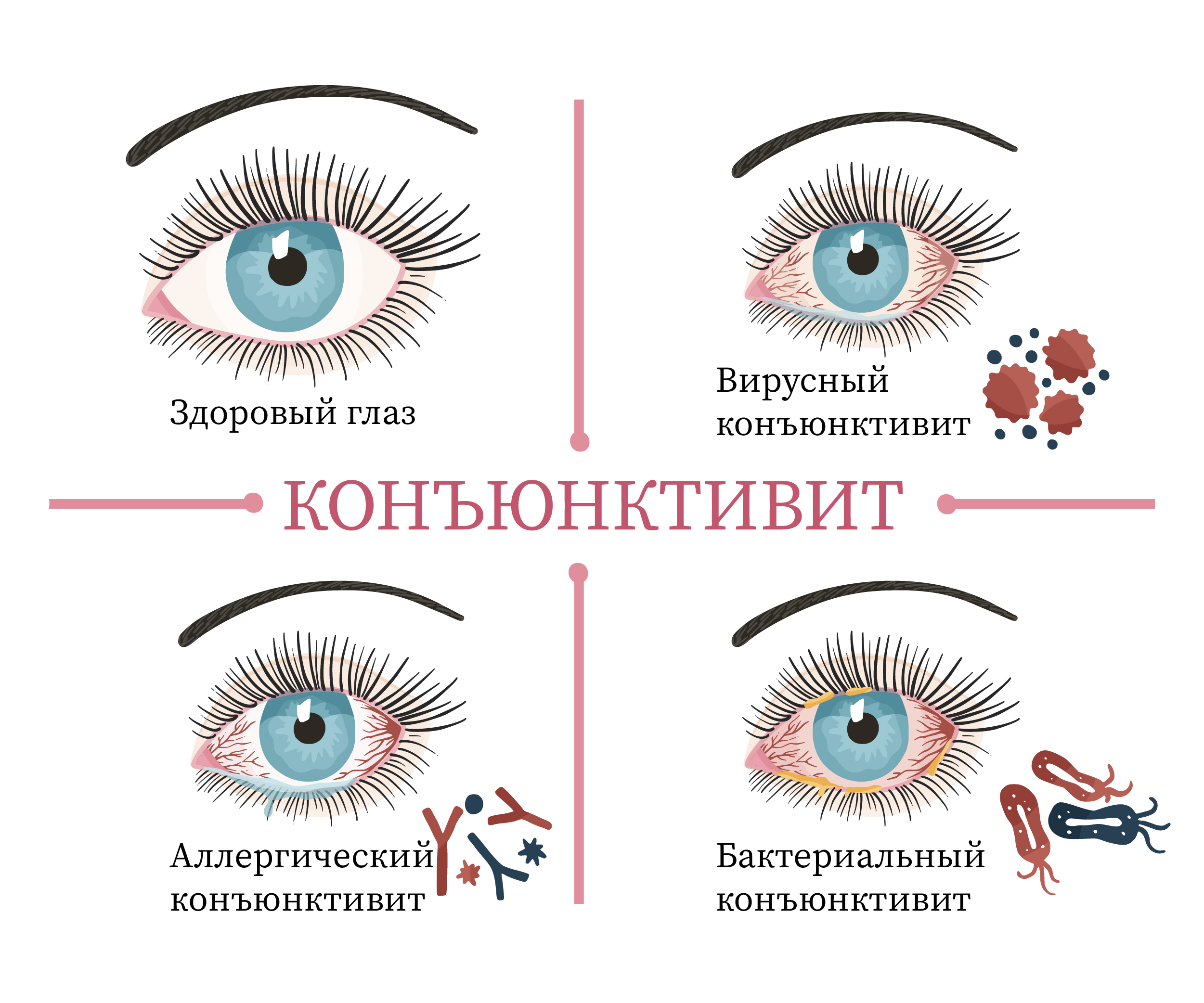 | Viral | Herpetic conjunctivitis: photophobia, profuse lacrimation, blepharospasm (involuntary closing of the eyelids), the appearance of watery blisters on the eyelids, as well as their redness and swelling. Adenoviral conjunctivitis: mucous discharge, burning, stinging, feeling of "sand" in the eyes, redness of the conjunctiva and eyelids, increased photosensitivity, lacrimation. Both eyes are affected at once. It is transmitted through contact with the patient, through hands, household items, etc. |