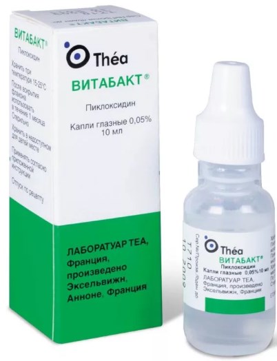 Antimicrobial drug, the main active ingredient of which is picloxidine diichloride. It is active against most pathogens of bacterial infections affecting the anterior part of the eyes. The course is 10 days, during which you should instill 1 drop from 2 to 6 times a day. Vitabact is sold in a sealed polyethylene bottle with a dropper. It is prescribed for the treatment of children from birth. Sold without a prescription.