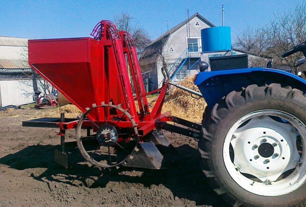The device is quite simple. The rotating wheels make the chain drive move. The potatoes from the installed hopper fall into the furrows made by the small opener. Then comes the ridge former, which, thanks to the presence of two rear discs, conducts a technological operation to form beds, filling up a fresh planting. The canopy is aggregated with a mini-tractor with a capacity of 16 l / s.This product is universal, so it can be used with various models of tractors, such as MTZ 132/320, T-254, VTZ and their analogues.
