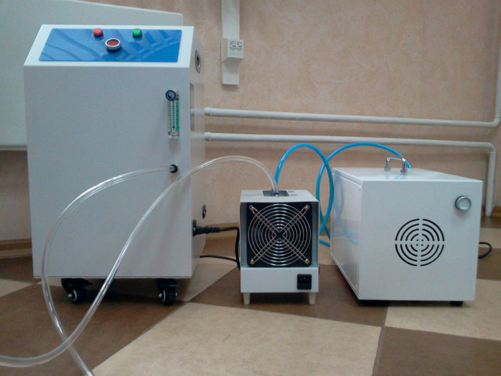 The apparatus consists of two cylinders, air enters the cylinders and passes through a "molecular sieve" (a network of zeolite balls), as a result oxygen up to 95% concentration is obtained at the outlet. The cylinders work in turn, one purifies oxygen, the second at this time converts the air mixture into oxygen. This ensures uninterrupted operation when supplying oxygen.