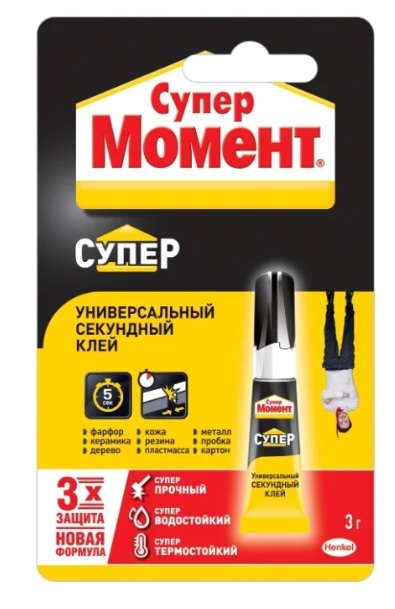 When fast fastening is needed, Henkel's Super Moment is a great help. Since this model is universal, it can be used to fasten objects made of plastic, wood, ceramics, porcelain or rubber. It is also suitable for porous products that have highly absorbent properties. To do this, a thin layer of "Super second moment" is applied to one of the surfaces of the part, after which another part should be immediately applied. Both parts must be firmly squeezed and held for a few seconds. Immediately after that, the fastened items are ready for further use. Work best with gloves and a mask. Because if the product comes into contact with the skin, it will instantly adhere. Super Seconds should not be used for utensils that are used for eating or preparing food.