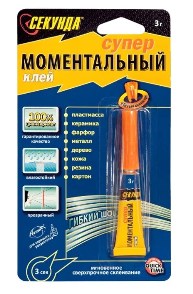 This cyanoacrylate product is suitable for bonding parts of any material. It is designed to work with leather, plastic, porcelain, metal, rubber, as well as cardboard. "Second super instant" is resistant to water, suitable for both outdoor and indoor work. It will cope with its task in the temperature range from -30 to +50 degrees. And the gluing takes only three seconds.