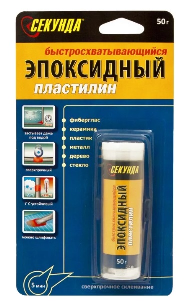 This product is a fast-setting mass that can bond products even under water. "Second epoxy plasticine" is suitable for working with plastic, metal, glass and ceramics. After solidification, a strong seam is formed that can withstand operating temperatures from -50 to +130 degrees. It is also resistant to chemical attack. The excess of the dried joint can be sanded.In addition, "Second epoxy plasticine" is used to fill cracks and seal products. The complete solidification time of the product is 5 minutes.