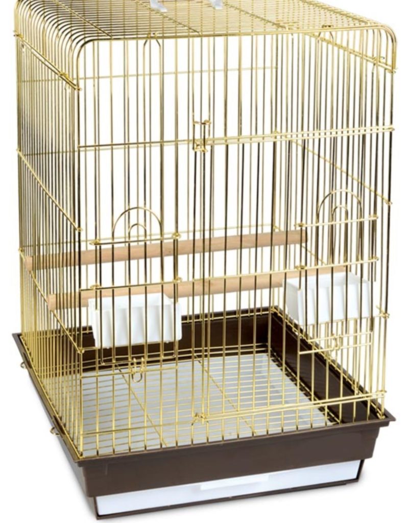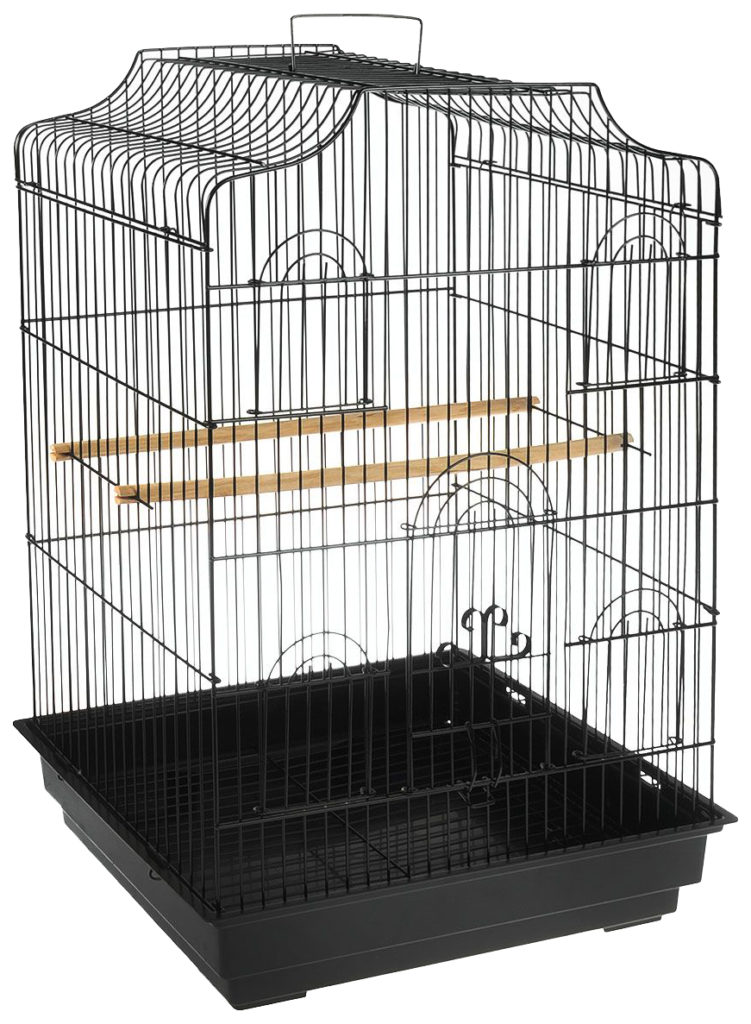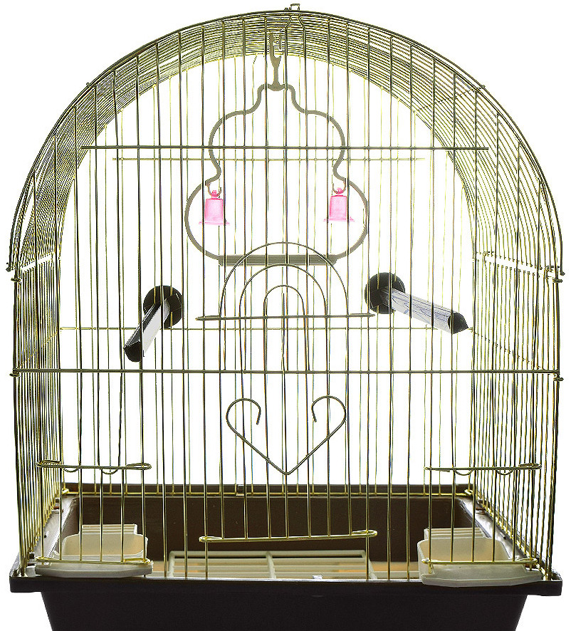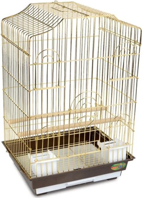 The products of this brand attract customers with their rich and beautiful designs. The metal part of the frame is treated with a golden coating, which is safe for the health of feathered inhabitants. The deep tray made of durable plastic can be pulled out. Its bottom is covered with a special grate that prevents parrots from accessing debris. The main dimensions of the structure are: length - 52 cm, depth - 41 cm, height - 59 cm. Available doors have parameters: large - 34.5 cm x 31.5 cm, and small - 10 cm x 9 cm. products within 5300 rubles. Additionally, the frame contains two feeders and perches.