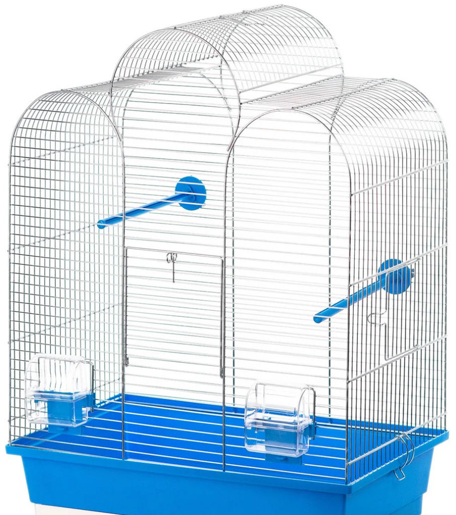 This model of the cage is a rectangular structure with a length of 40 cm, a depth of 23.5 cm and a height of 38.5 cm. Its cost is about 2500 rubles. It is convenient for keeping budgerigars and provides them with optimal space due to its rounded shape. The “House” is equipped with a removable plastic tray, which ensures efficient and quick cleaning. Inside there is everything you need for a comfortable stay of feathered pets: