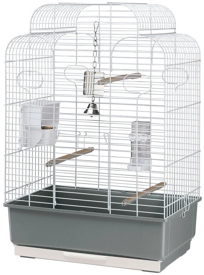 Italian producers launch goods for the consumer market for cockatiel parrots and other medium-sized birds. Their dimensions are: length - 49.5 cm, depth - 30 cm, height - 75.5 cm.The cost is about 7000 rubles. The frame is made of durable metal wire with a plastic coating that protects it from any mechanical damage. The deep and removable tray helps to keep the room clean and makes it easier to clean the inside of the bird's home. The kit includes all the necessary accessories.