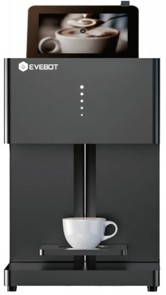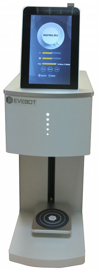 The EVEBOT color coffee printer is an improved model of previous versions. The innovations include a new motherboard, an ink supply mechanism, the ability to print with edible ink with the addition of coffee extract. The volume of the cartridge has been increased up to 800 drawings, the new cartridge does not have to be replaced after the end of ink, the design provides for the possibility of refueling.