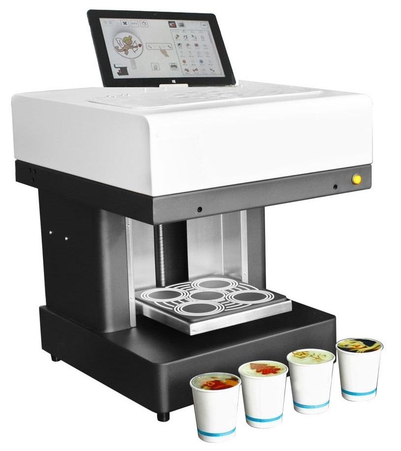 This is, in fact, a food 3D printer that prints on everything. Coffee, dough, cream, chocolate, ice cream and much more are suitable as material for drawing pictures. There are no cartridges, the ingredients are loaded directly into the device body.