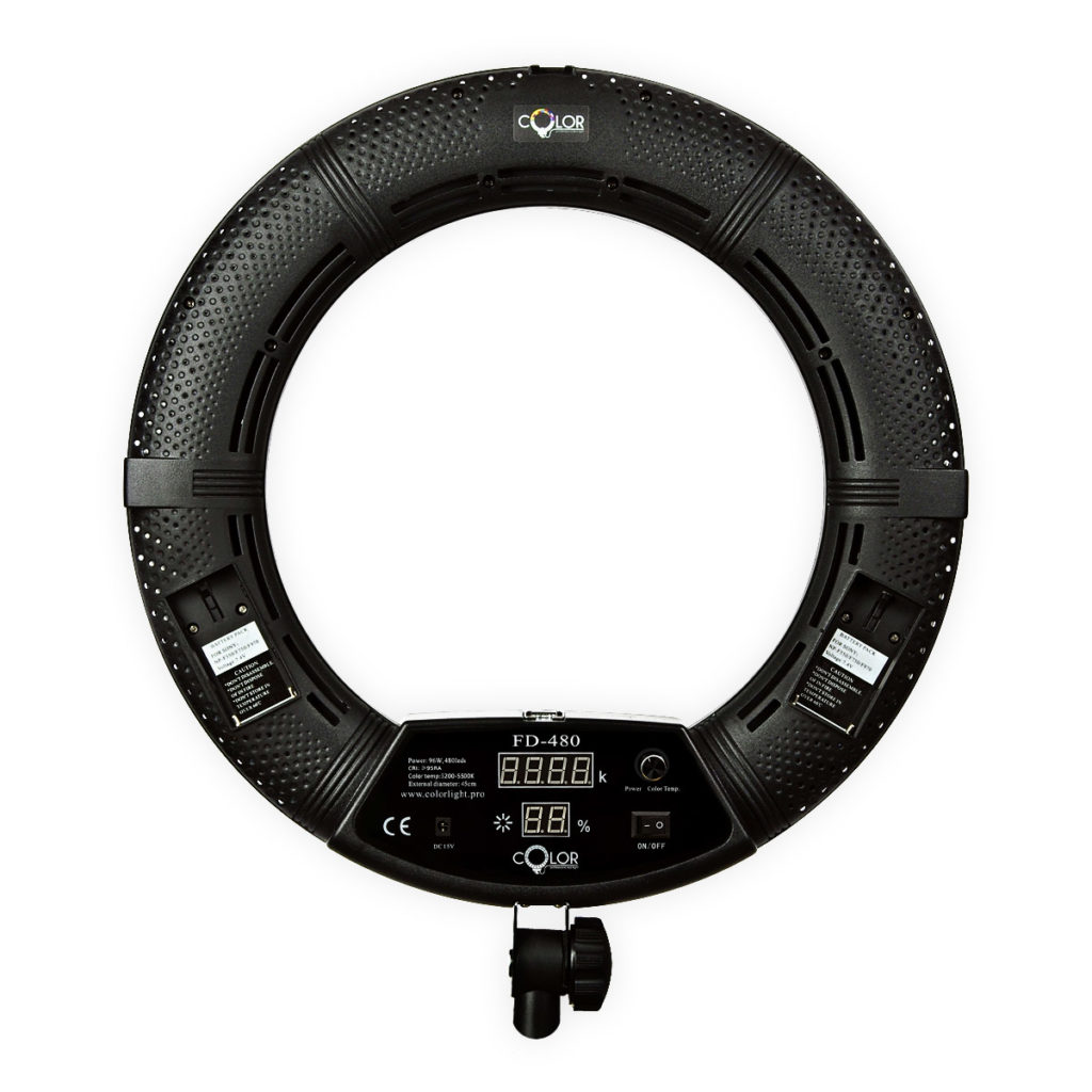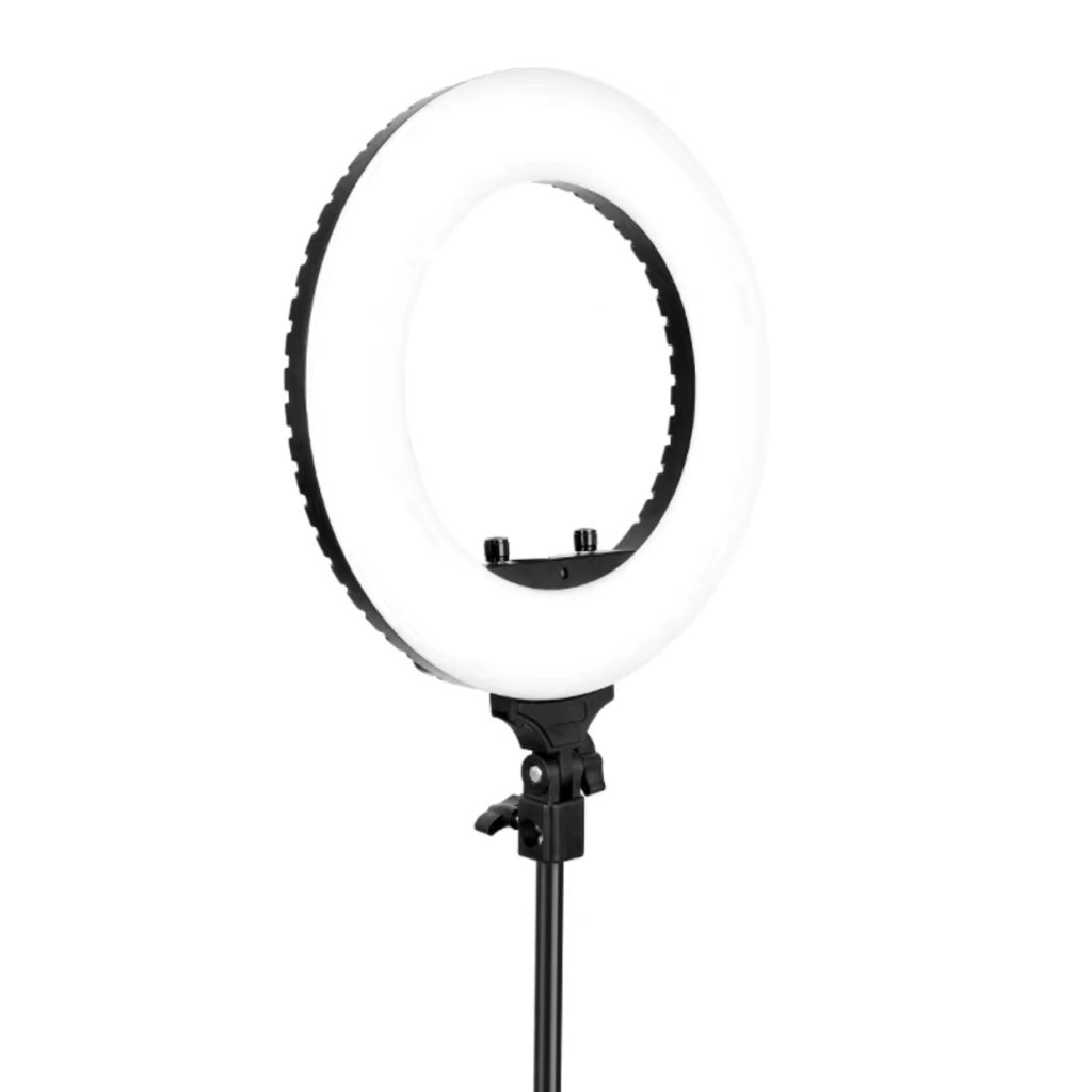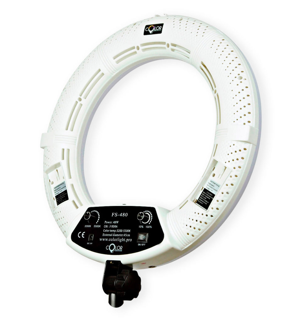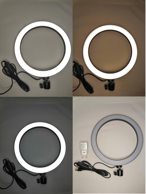 Compact, lightweight ring lamp that makes it easy to transport when your activity is on-site. Power supply - mains, the device can function continuously for 3 hours. Some of the LEDs create a cold glow, some - a warm one, the temperature of the light is adjusted or the desired shade is selected using a dimmer. The glow is as similar as possible to natural light, which is necessary in detailed photography and video filming, the work of makeup artists, stylists, and cosmetologists.