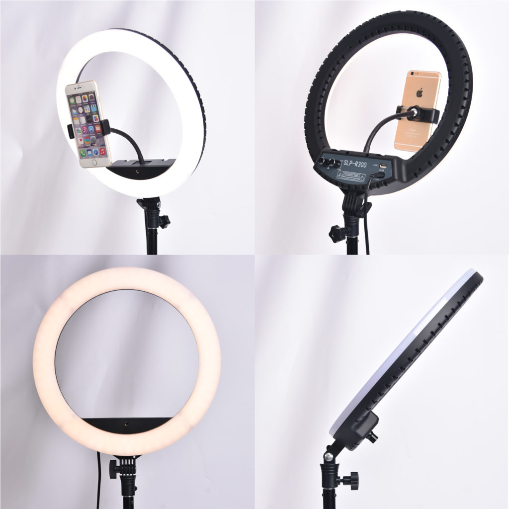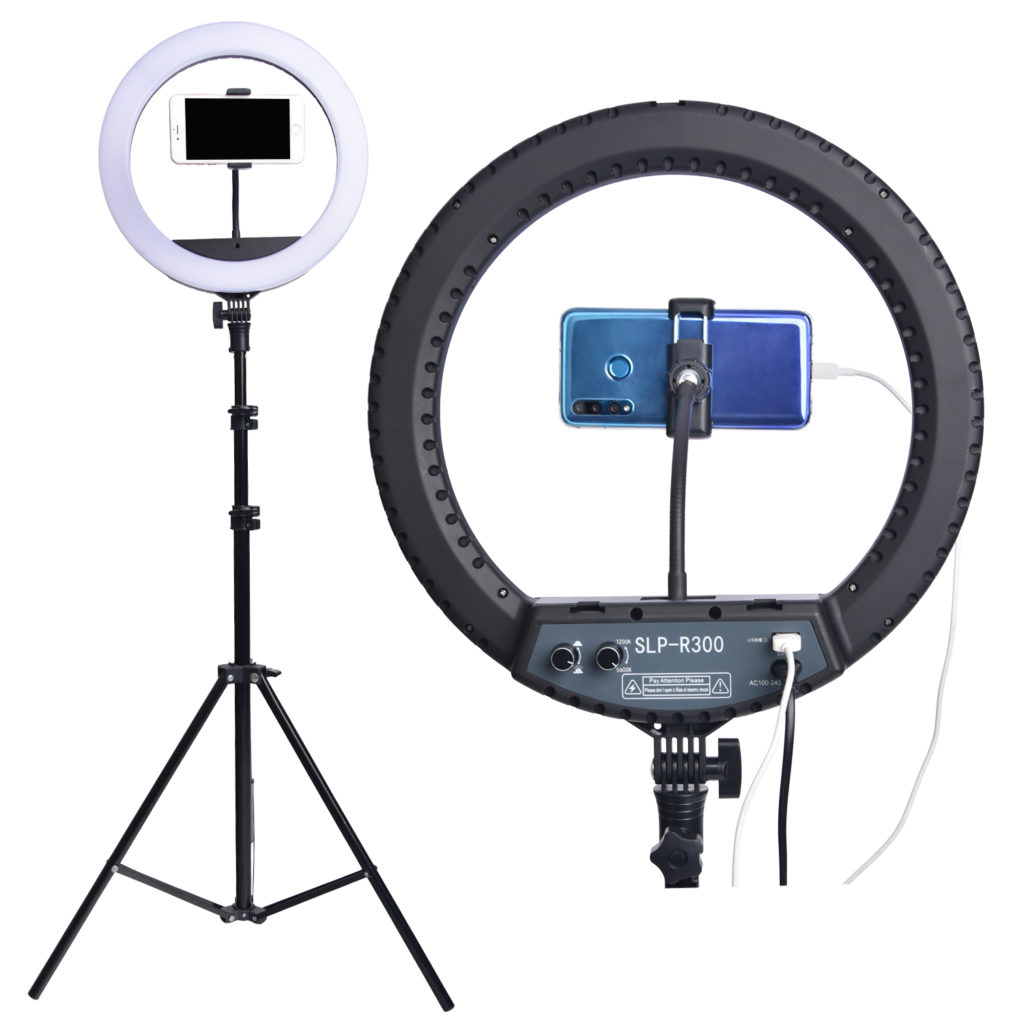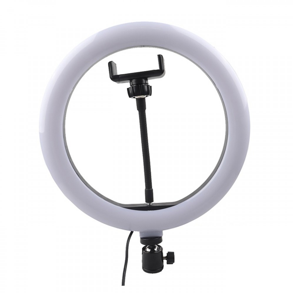 Compact, lightweight ring lamp that makes it easy to transport when your activity is on-site. Power supply - mains, the device can function continuously for 3 hours. Some of the LEDs create a cold glow, some - a warm one, the temperature of the light is adjusted or the desired shade is selected using a dimmer. The glow is as similar as possible to natural light, which is necessary in detailed photography and video filming, the work of makeup artists, stylists, and cosmetologists.